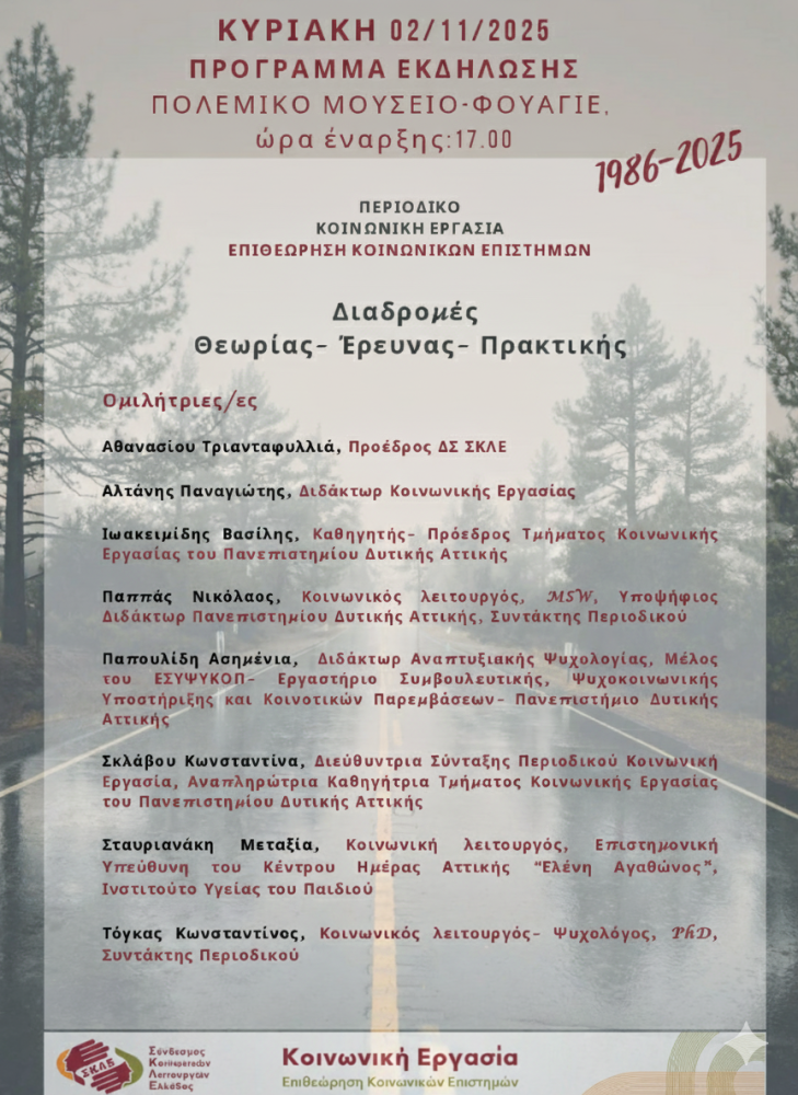 Ο Σύνδεσμος Κοινωνικών Λειτουργών Ελλάδος και το Διοικητικό Συμβούλιο, ως εκδότης του Περιοδικού Κοινωνική Εργασία – Επιθεώρηση Κοινωνικών Επιστημών καθώς και η Συντακτική Επιτροπή του Περιοδικού σας καλεί στις 02 Νοεμβρίου, ημέρα Κυριακή και ώρα 17:00, στο Φουαγιέ του Πολεμικού Μουσείου σε εκδήλωση προκειμένου να τιμήσουμε τη διαδρομη του Περιοδικού και όσους και όσες συντέλεσαν στην ανάπτυξή του.