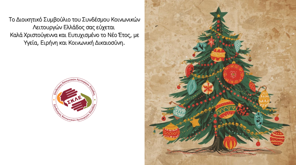 Το Διοικητικό Συμβούλιο του Συνδέσμου Κοινωνικών Λειτουργών Ελλάδος σας εύχεται Καλά Χριστούγεννα και Ευτυχισμένο το Νέο Έτος με Υγεία, Ειρήνη και Κοινωνική Δικαιοσύνη