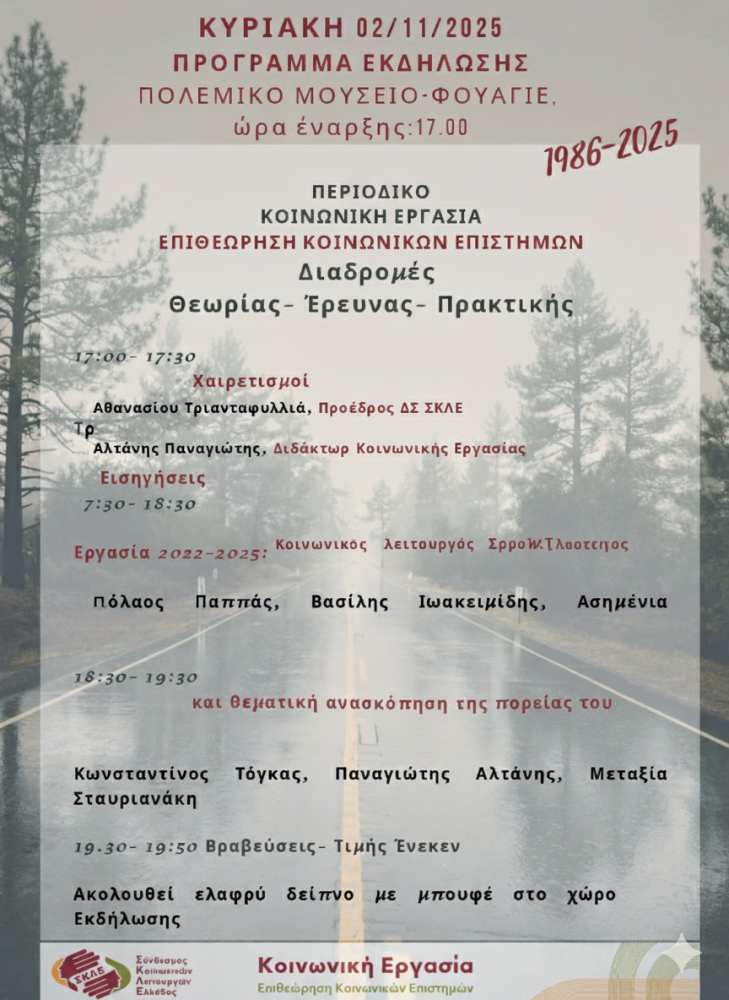 Ο Σύνδεσμος Κοινωνικών Λειτουργών Ελλάδος και το Διοικητικό Συμβούλιο, ως εκδότης του Περιοδικού Κοινωνική Εργασία – Επιθεώρηση Κοινωνικών Επιστημών καθώς και η Συντακτική Επιτροπή του Περιοδικού σας καλεί στις 02 Νοεμβρίου, ημέρα Κυριακή και ώρα 17:00, στο Φουαγιέ του Πολεμικού Μουσείου σε εκδήλωση προκειμένου να τιμήσουμε τη διαδρομη του Περιοδικού και όσους και όσες συντέλεσαν στην ανάπτυξή του.