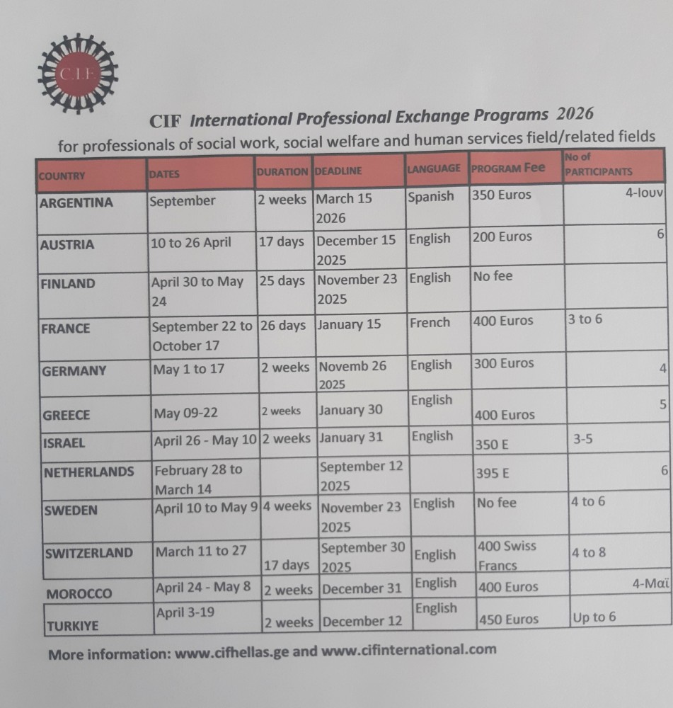 Το Δ.Σ. του CIF Hellas (www.cifhellas.gr) απέστειλε ενημέρωση /ανακοίνωση στο ΣΚΛΕ για τα διεθνή προγράμματα Ανταλλαγής Επαγγελματιών που λαμβάνουν χώρα στην παρούσα φάση και μέχρι τον Ιούνιο του 2026, με την παράκληση για τη σχετική ενημέρωση των Κοινωνικών Λειτουργών.