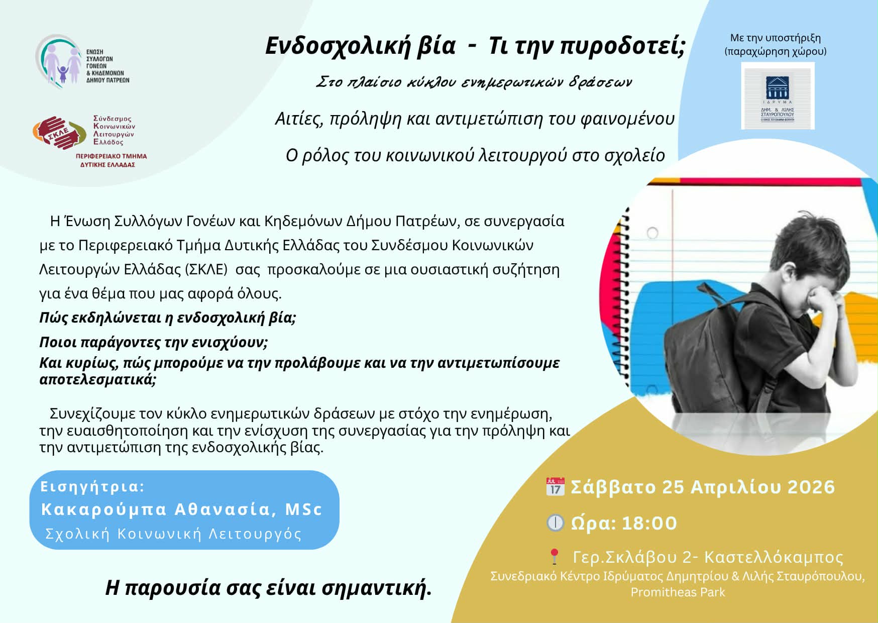 To Περιφερειακό Τμήμα Δυτικής Ελλάδας του ΣΚΛΕ σας προσκαλεί στην ενημερωτική συνάντηση που διοργανώνει σε συνεργασία με την Ένωση Γονέων του Δήμου της Πάτρας για την Ενδοσχολική Βία. Η συνάντηση στοχεύει σε έναν ουσιαστικό διάλογο μεταξύ των Γονέων και των Κοινωνικών Λειτουργών για το ρόλο μας στη σχολική κοινότητα και τη συνεργασία μας με το σχολείο και την οικογένεια των μαθητών/τριών.
